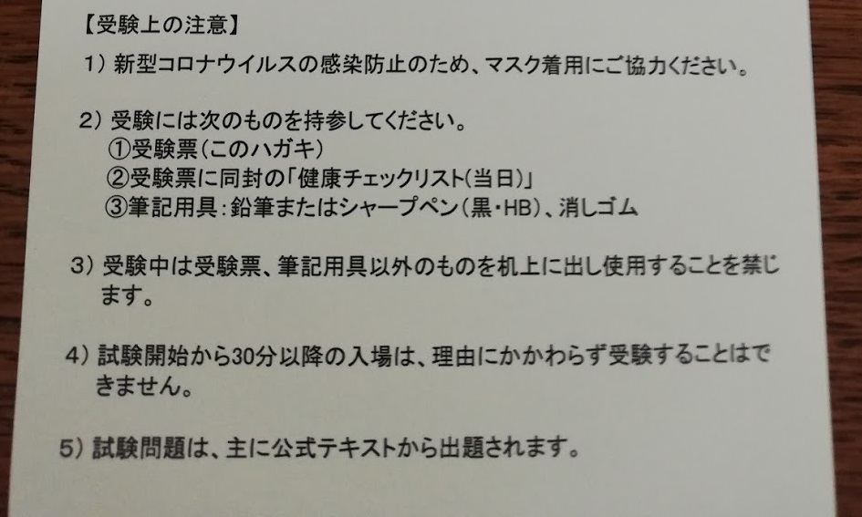 受験票の【受験上の注意】の一番下に「試験問題は、主に公式テキストから出題されます」の意味が受験してわかる形式であった。上述のようにまんまコピペの穴埋め問題が出たりもしていた。
